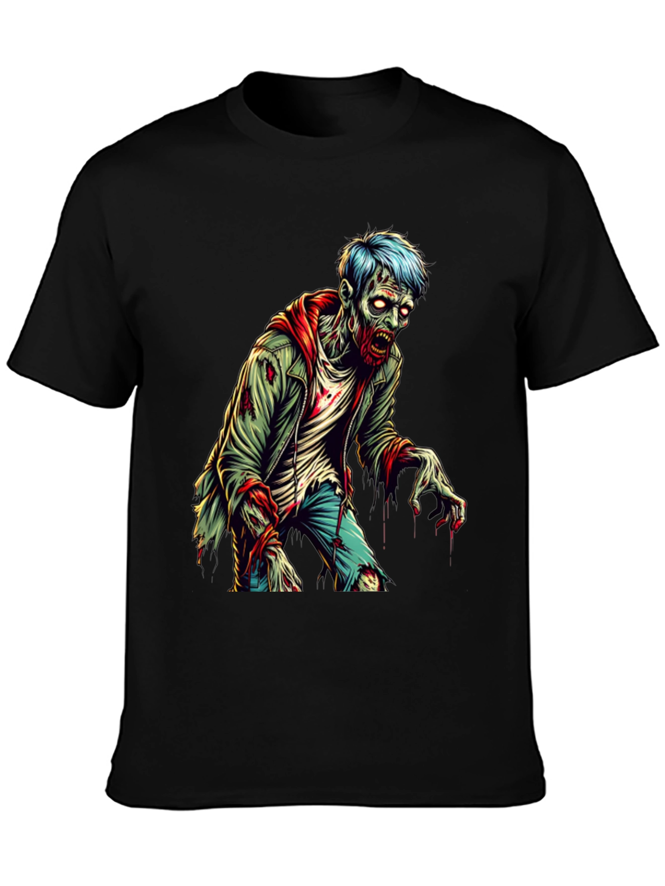 Embrace your inner ghoul with this striking zombie graphic t-shirt. The design features a vibrant, detailed zombie illustration with decaying features and piercing eyes on a classic black tee. Perfect for horror enthusiasts, Halloween events, or anyone looking to add a touch of the macabre to their wardrobe. Made from comfortable, breathable fabric, this t-shirt offers both style and comfort. Stand out from the crowd with this unique and eye-catching zombie tee! Let the world know you're ready for the apocalypse with this awesome undead style statement.